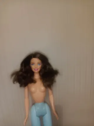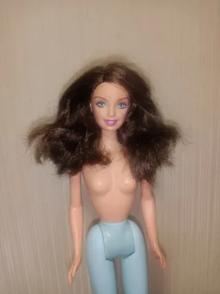 Bambola Barbie con capelli castani e trucco vivace. - Occhi azzurri e labbra arancioni. - Capelli lunghi e mossi. - Corpo snodabile.