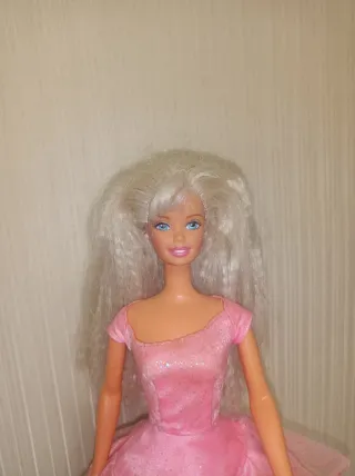 Bambola Barbie con un elegante vestito rosa scintillante. I capelli sono lunghi e biondi, gli occhi azzurri. - Vestito rosa con glitter. - Capelli biondi lunghi. - Occhi azzurri.