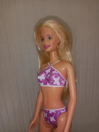 Bambola Barbie con un bikini a fantasia di farfalle. - Bikini a due pezzi. - Fantasia di farfalle bianche su sfondo rosa glitterato.