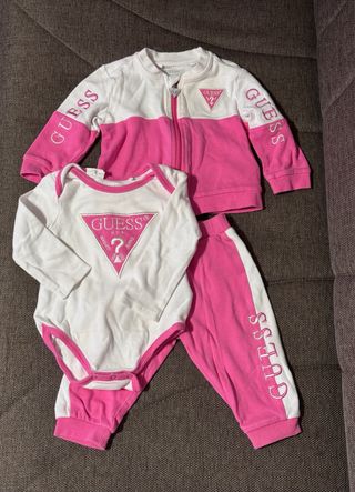 Bellissimo set Guess per neonato, taglia 6/9 mesi, composto da felpa con zip, body e pantaloni. - Felpa bianca e fucsia con zip e logo Guess. - Body bianco a manica lunga con logo Guess. - Pantaloni fucsia con banda laterale bianca e logo Guess. - Morbido tessuto in cotone.