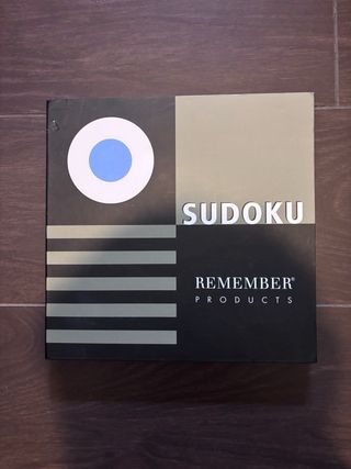 Gioco di logica Sudoku di Remember Products. Un classico passatempo per allenare la mente. - Design moderno con cerchio bianco e blu. - Strisce orizzontali grigie. - Logo Remember Products ben visibile.