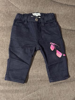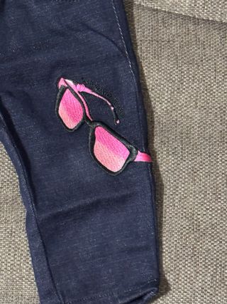 Bellissimi jeans Emporio Armani per neonata. - Taglia 6 mesi. - Colore blu scuro. - Applicazione a forma di occhiali da sole rosa sulla gamba destra.