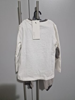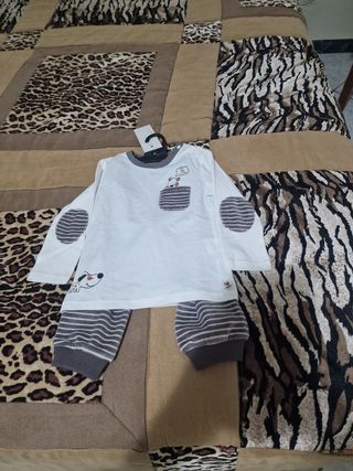Grazioso completo per bambino composto da maglia a maniche lunghe e pantaloni. - Maglia bianca con taschino a righe e simpatico disegno di un cane. - Patch a righe sui gomiti. - Pantaloni a righe grigie e bianche.