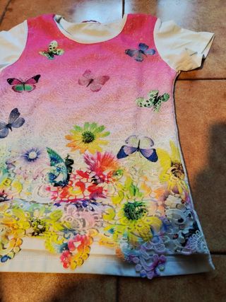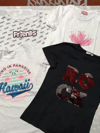 Lotto composto da 4 magliette da ragazze con diverse stampe. - Maglietta bianca con scritta Friends e pattern di parole OVS - Maglietta bianca con stampa floreale Original Marines - Maglietta bianca con stampa Hawaii e fenicotteri Blukids - Maglietta nera con scritta ROCK in paillettes Blukids 12-13, 13-14 anni vestono piccolo