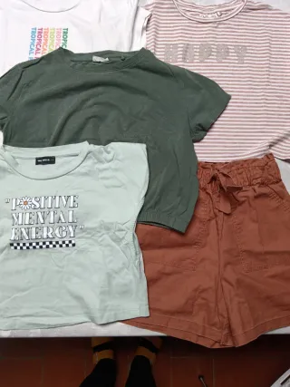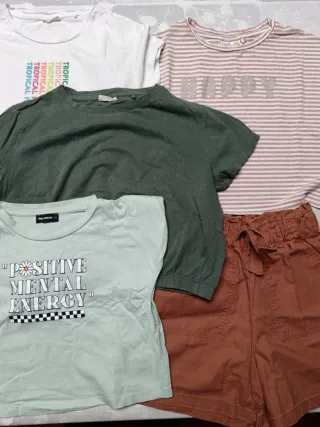 Lotto composto da magliette corte e shorts per bambina 11-12 anni - Maglietta bianca con scritta Tropical OVS - Maglietta a righe rosa con scritta Happy OVS - Maglietta verde OVS - Maglietta verde menta con scritta POSITIVE MENTAL Energy Tally Weijl - Shorts color ruggine con laccetto in vita OVS