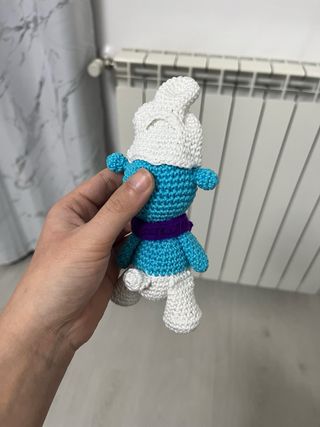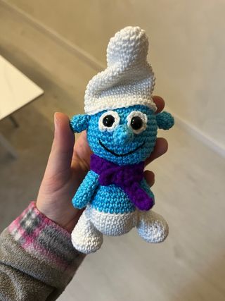 Dolce Puffo realizzato all'uncinetto a mano, perfetto per collezionisti o come regalo. - Colore blu con cappello bianco. - Indossa una sciarpa viola. - Dettagli ricamati per viso e corpo.