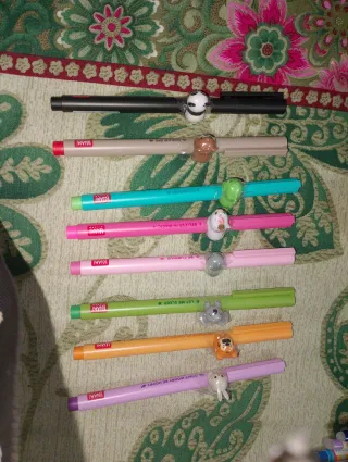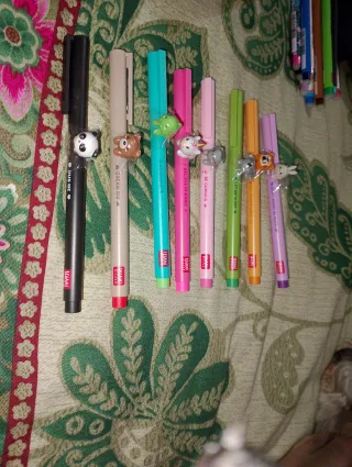 Set di 9 penne della collezione Legami Friends, ognuna con un simpatico personaggio. - Penna nera con panda - Penna beige con orsetto - Penna turchese con ranocchia - Penna fucsia con coniglietto - Penna rosa con gatto - Penna verde con elefante - Penna arancione con scoiattolo - Penna viola con coniglio - Penna Turchese con Lama