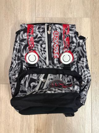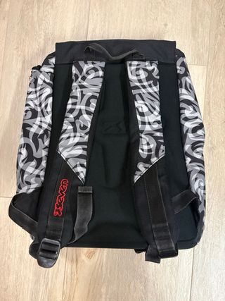 Zaino Seven con un design unico e accattivante. - Fantasia astratta in bianco, nero e rosso. - Zip centrale e tasca frontale con zip. - Dettagli rotondi rossi con logo bianco.