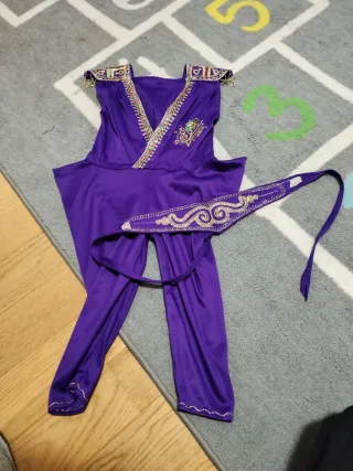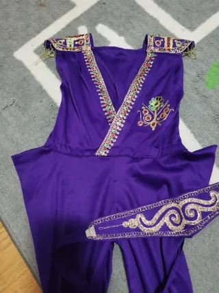 Bellissimo vestito da carnevale viola, perfetto per feste e travestimenti. - Tessuto lucido e colorato. - Dettagli ricamati sul colletto e sulla cintura. - Maniche corte con frange decorative. - Pantaloni lunghi con bordi decorati.