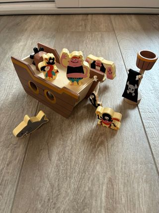 Set di gioco a tema pirati con una nave in legno e vari personaggi. Flying tiger - Nave in legno con dettagli colorati. - Personaggi in legno tra cui pirati e un pappagallo. - Include anche uno squalo e una bandiera pirata.
