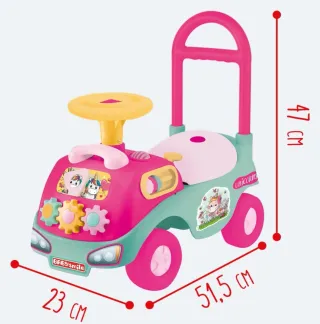 Macchinina cavalcabile per bambini, ideale per i più piccoli. - Colore principale rosa con dettagli azzurri. - Volante giallo. - Manico posteriore per spingerla.