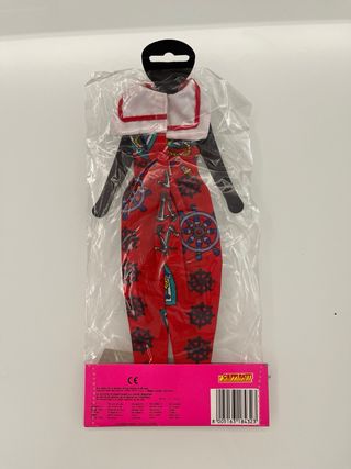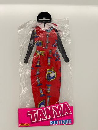 Abito vintage Tanya anni '90, parte della linea Boutique. - Fantasia a tema nautico con ancore, fari e timoni. - Colori vivaci su sfondo rosso. - Modello da bambola, confezionato.