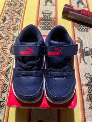 Scarpe Puma per bambini in un vivace colore blu con dettagli rossi. - Logo Puma rosso sul velcro. - Chiusura con velcro e lacci. - Design con perforazioni sulla punta. -MAI INDOSSATO