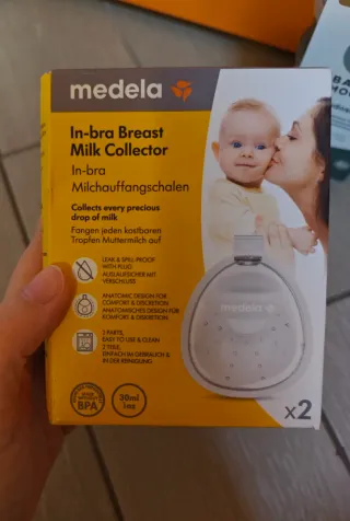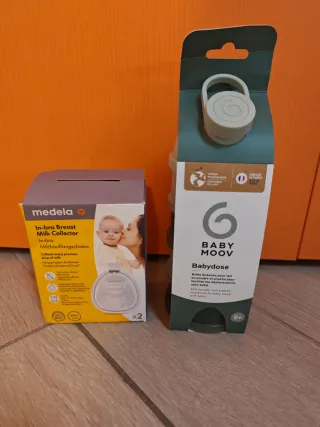 Set composto da raccogli latte Medela e contenitore Baby Moov. - Raccogli latte In-bra Breast Milk Collector Medela. - Contenitore Babydose Baby Moov per latte in polvere o snack.