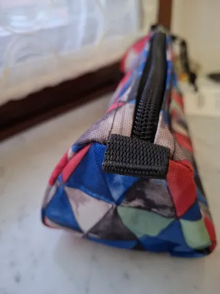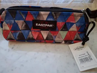 Astuccio Eastpak modello Benchmark Single con una fantasia geometrica nuovo con cartellino - Fantasia con triangoli multicolore. - Chiusura con zip. - Logo Eastpak applicato frontalmente.
