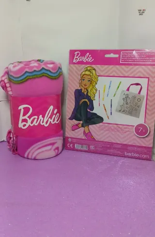 Set Barbie con plaid morbido, colore rosa acceso misura 100x140 cm Borsetta da colorare misura 23x 22 con 6 pennarelli per colorare inclusi. - Plaid in pile rosa con stampa Barbie. - Borsetta in tessuto bianco da personalizzare. - Include pennarelli colorati.