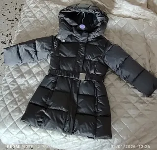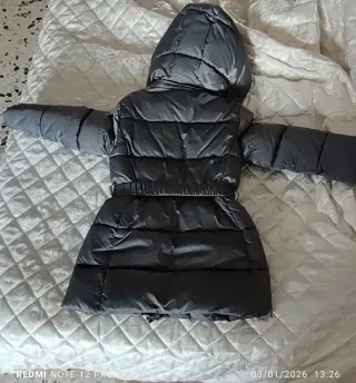 Caldo piumino grigio per bambina, perfetto per le giornate fredde. - Cappuccio integrato. - Cintura in vita con fibbia. - Chiusura frontale con zip e bottoni. - Maniche lunghe.