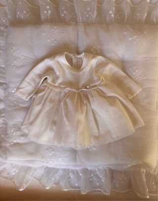 Bellissimo set Mayoral per il battesimo di una bambina, completo di abito, fascia, scarpine e cuscino battesimale. Abito Mayoral: - Maniche lunghe in maglia e tulle luminoso con brillantini. - Targhetta dorata con logo davanti. - Chiusura posteriore con bottoni. - Composizione: 65% poliestere, 25% viscosa, 10% poliammide. - Taglia 2-4 mesi - 65 cm. Scarpine Mayoral: - Scarpine con fiocco. - Taglia 16. Fascia floreale. Cuscino battesimale: - Con ricami e volant. - Misure cuscino: 60 cm x 55 cm. - Misure cuscino con volant: 81 cm x 71 cm. Tutto in perfette condizioni, usato solo una volta per il Battesimo.
