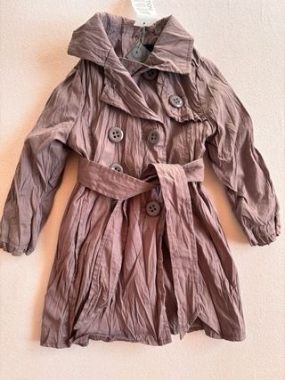 Elegante trench per neonata con un particolare effetto stropicciato che dona un tocco unico. - Chiusura doppiopetto con bottoni. - Cintura in vita per una vestibilità regolabile. - Ampio colletto. - Maniche lunghe. - Un bottone di ricambio. - Taglia 74 cm - 9-12 mesi. - Composizione esterno: 70% cotone, 30% poliammidica-nylon. - Composizione interno: 100% poliestere. - Nuovo con cartellino.