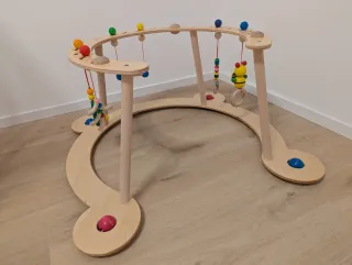 Palestrina in legno naturale per bambini, ideale per stimolare i più piccoli. - Struttura in legno. - Giochi pendenti colorati. - Design curvo.
