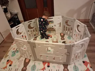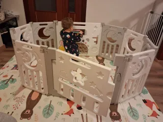 Parco per bambini Star Ibaby Play Twin con porta di sicurezza. - Pannelli di plastica colorata. - 4 tappetini puzzle inclusi (non quelli nella foto artistica) vedere l'ultima foto - Facile da montare e smontare. - Diverse opzioni di montaggio: 4, 6 e 8 lati - Dimensioni approssimative montato con 8 pezzi: 1,50 * 1,50 m. - Alcune parti presentano piccoli difetti nella parte superiore, ma non rappresentano alcun pericolo per il bambino o l'uso. Vedere foto