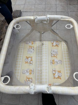 Recintino di sicurezza per bambini con un design moderno e funzionale. - Ampia superficie di 150x150 cm. - Struttura in metallo e rete traspirante. Una delle barre è divisa e riparata. Funziona correttamente. - Facile da montare e smontare. Con borsa per il trasporto inclusa. Non include il tappeto.