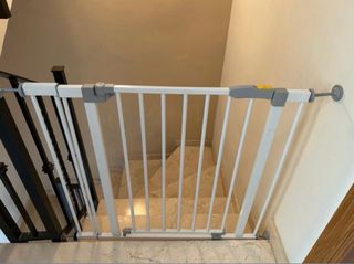 Ringhiera di sicurezza per scale o porte, ideale per proteggere i più piccoli. - Struttura metallica grigia. - Sistema di chiusura. - Include accessori di montaggio.