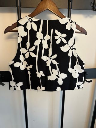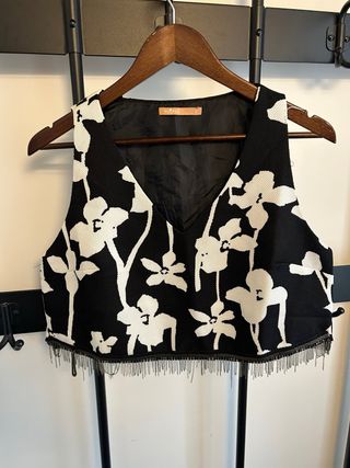 Top corto da bambina con fantasia floreale e dettagli di frange sul fondo. - Fantasia floreale bianco e nero. - Orlo con frange metalliche. - Scollo a V.