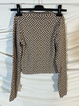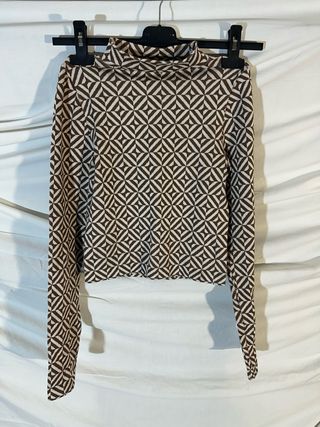 Maglioncino Stradivarius da bambina con fantasia geometrica. Scollo alto e maniche lunghe. - Fantasia geometrica marrone e bianca. - Tessuto a costine. - Scollo alto a collo. Taglia XS, ampiezza spalle 30cm
