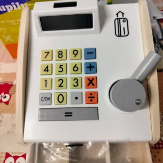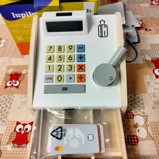 Gioco per bimbi dai 3 anni in su. Per giocare a cassa, funziona con batteria solare, display digitale e scanner sonoro.