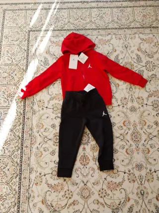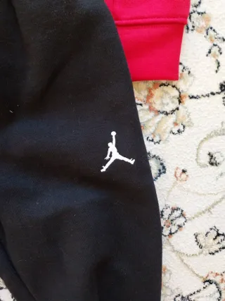 Set composto da felpa con cappuccio e pantaloni Jordan. - Felpa rossa con zip e logo. - Pantaloni neri con logo.