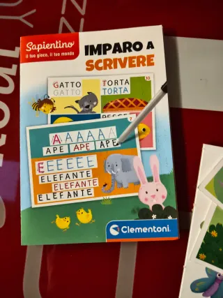 Libro educativo Sapientino Imparo a Scrivere di Clementoni. Aiuta i bambini ad imparare a scrivere. - Include esercizi per lettere e parole. - Illustrazioni colorate con animali e oggetti. - Penna inclusa per scrivere e cancellare.