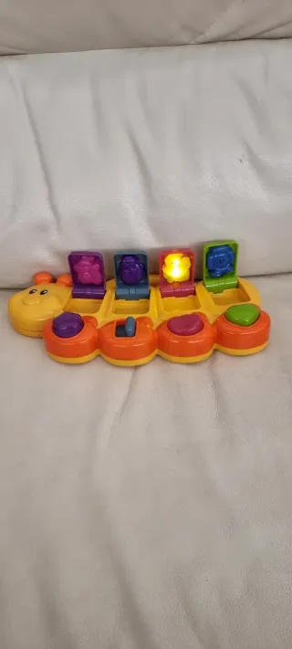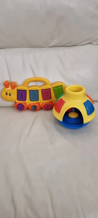 Set di due giocattoli colorati e interattivi si illuminano e suonano canzoncine. Sono in perfette condizioni pile nuove. - Un bruco giallo con pulsanti numerati e ruote. - Una palla gialla con aperture colorate per inserire forme.