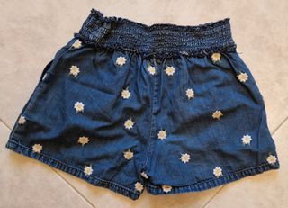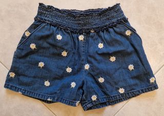 Bellissimo shorts in denim per bambina, taglia 4 anni, con simpatici fiori ricamati. - Vita elasticizzata. - Tessuto denim. - Fantasia con fiori bianchi e gialli.