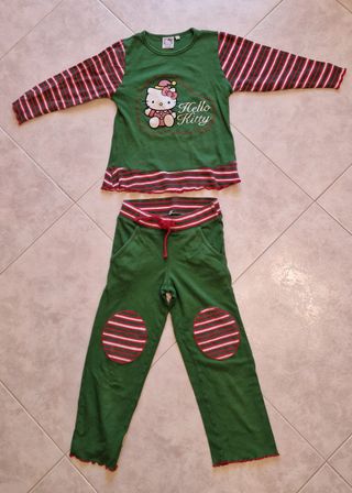 Grazioso pigiama per bambina con protagonista Hello Kitty. - Maglia verde a maniche lunghe con stampa Hello Kitty. - Pantaloni verdi. - Dettagli a righe rosse e bianche su maniche, bordo maglia e cintura pantaloni. - Toppe a forma di cerchio a righe sulle ginocchia.