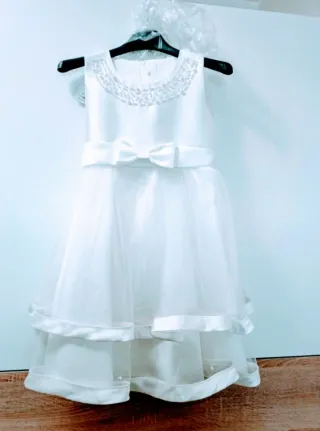 Elegante abito da damigella, perfetto per cerimonie. Colore bianco latte.- Scollo decorato con perline.- Fiocco in vita. - Gonna in tulle a più strati. - Orlo rifinito con nastro di raso. Abito da cerimonia elegante bambina 6 anni bianco con pelo alla gonna e raso al petto e grande fiocco dietro la schiena con cerniera di apertura. Marca guinini nuovo senza cartellino a manica giro con piccola pausa di raso. Molto delicato. È bello da indossare come damigella o comunione o cerimonia importanti. Modello corto fino al ginocchio. Nuovo senza cartellino #damigella #matrimonio #cerimonia #sposa #weddingdress #wedding #sposo #abitidaspo