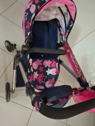 Passeggino per bambole con una vivace fantasia di stelle e cerchi rosa e blu. - Struttura in metallo argentato. - Tessuto con stampa stelle e pois. - Cappottina parasole regolabile. - Cestello portaoggetti inferiore. - Borsa coordinata agganciata al manico.