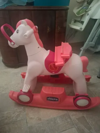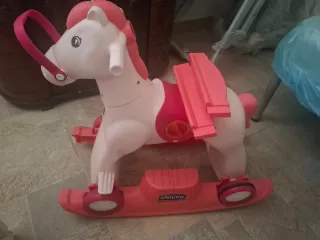 Cavalluccio dondolo per bambini marca Chicco, di colore rosa e bianco. - Manico rosa per accompagnare i primi passi. - Seduta comoda. - Base a dondolo.