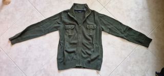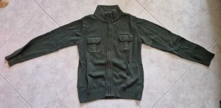Maglione Okaidi per bambino, taglia 10 anni, di colore verde. - Zip frontale. - Due tasche sul petto con bottone. - Collo alto.