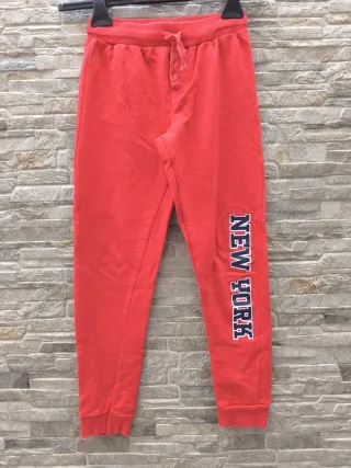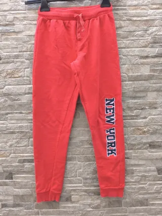 Pantaloni tuta rossi con scritta New York sul lato. - Vita elasticizzata con laccetti. - Polsini alla caviglia. - Tessuto morbido.