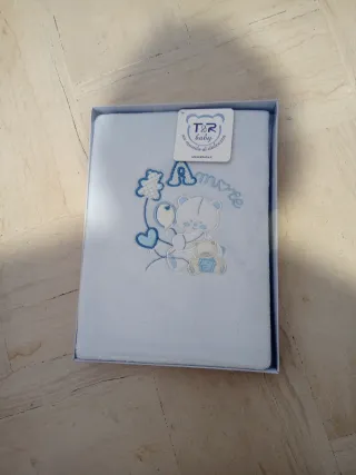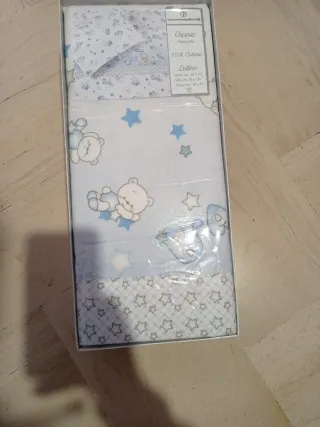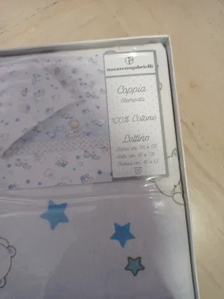 Set di lenzuola per lettino in cotone caldo, con un simpatico disegno di pupazzi e stelle. - Tessuto: 100% Cotone - Misure lenzuolo sotto con angoli: 70 x 130 cm - Misure lenzuolo sopra: 110 x 160 cm - Misure federa: 40 x 50 cm