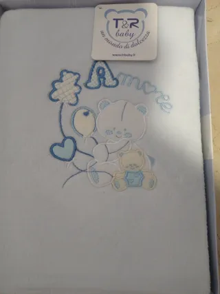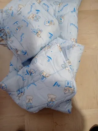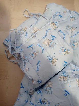 Trapunta e paracolpi per lettino da bambino con un simpatico disegno di orsetti e lettere. - Fantasia double face. - Motivo con orsetti e lettere. - Colore azzurro.