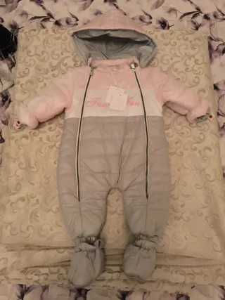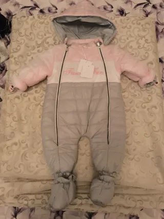 Morbida tuta invernale per bambina, perfetta per le giornate più fredde. Presenta una combinazione di colori vivaci e dettagli curati. - Colore principale: rosa e grigio. - Cappuccio integrato. - Chiusura frontale con zip. - Piedini integrati.