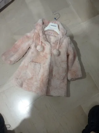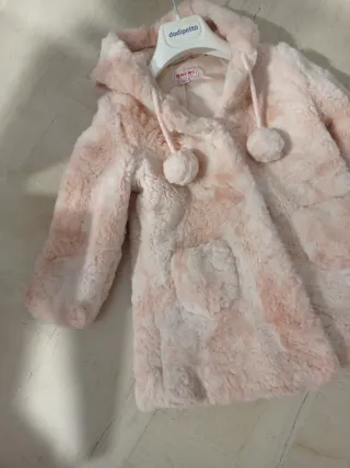 Morbido cappottino in pellicciotto per bambina. - Taglia 24 mesi. - Marca Brums. - Colore rosa con fantasia. - Cappuccio con pompon. - Tasche frontali.