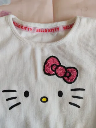 Grazioso vestito intero per bambina a tema Hello Kitty. La maglia è bianca con il viso di Hello Kitty e un fiocco rosa. Misura altezza vestito cm 60. Parte superiore cm 23, parte inferiore (gonna) cm37. - Gonna in tulle rosa brillante. - Fantasia di Hello Kitty ripetuta sulla gonna. - Maniche corte.