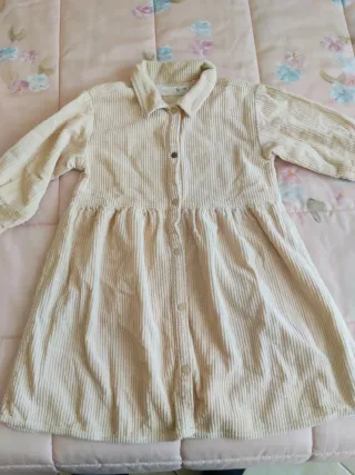 Vestito per bambina in morbido velluto a coste. - Colore beige neutro. - Maniche lunghe. - Chiusura con bottoni. - Gonna svasata con pieghe.