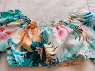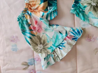 Set coordinato per bambina composto da top e pantaloncino. - Fantasia floreale tropicale. - Top con maniche a volant. - Pantaloncino con elastico in vita e volant.