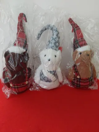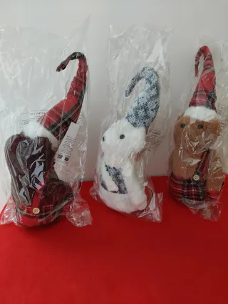 Set di 3 pupazzi natalizi in stile gnomo, Perfetti per decorare la casa durante le feste. - Pupazzo con cappello a quadri rossi e bianchi. - Pupazzo bianco con cappello a maglia grigio e bianco. - Pupazzo con salopette a quadri rossi e bianchi.