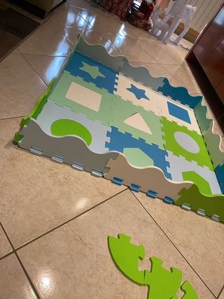 Tappeto gioco composto da diversi pannelli puzzle con forme geometriche. - Colori assortiti: blu, verde, azzurro e bianco. - Forme incluse: stelle, quadrati, cerchi, esagoni e triangoli. - Bordi ondulati per un facile incastro.