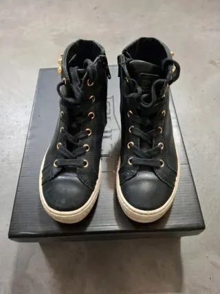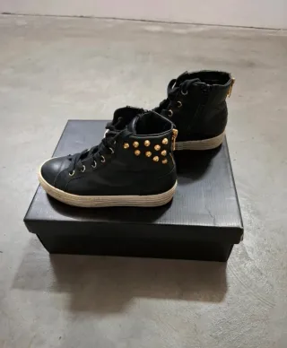 Scarponcini neri CULT per bambina, numero 31. Modello Leather Soft Black/Gild CLJ101435. Dettagli con borchie dorate sulla parte alta. - Materiale esterno in pelle. - Suola in gomma bianca. - Zip laterale. - Borchie decorative.